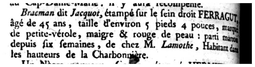 Un Nègre nouveau, Congo, étampé Hermite, âgé d'environ 20 ans; parti marron depuis environ un mois. En donner avis à M. Hermite, Commandant de la paroisse du Cap-Dame-Marie; au Port-au Prince, à [M.] Marchand; à Jérémie, à Mrs B. Vernier Reychet & [?].
