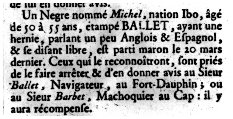 Un Negre nommé Michel, nation Ibo, âgé de 50 à 55 ans, étampé BALLET, ayant une hernier, parlant un peu Anglais & Espagnol, & se disant libre, est parti maron le 20 mars dernier. Ceux qui le reconnaîtront, sont priés de le faire arrêter & d'en donner avis au Sieur Ballet, Navigateur, au Fort-Dauphin ; ou au Sieur Barbet, Machoquier au Cap : il y aura récompense.