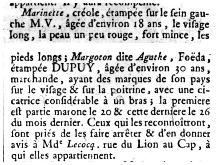 Marinette, créole, étampée sur le sein gauche M.V., âgée d'environ 18 ans, le visage long, la peau un peu rouge, fort mince, les pieds longs ; Margoton dite Agathe, Foëda, étampée DUPUY, âgée d'environ 30 ans, marchande, ayant des marques de son pays sur le visage & sur la poitrine, avec une cicatrice considérable à un bras ; la premiere est partie marone le 20 & cette dernier le 26 du mois dernier. Ceux qui les reconnaîtront, sont priés de les faire arrêter & d'en donner avis à Mde Lecocq. rue du Lion au Cap, à qui elles appartiennent.