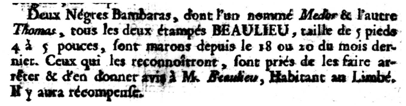 Deux Negres Bambaras, dont l'un nommé Medor & l'autre Thomas, tous les deux étampés BEAULIEU, taille de 5 pieds 4 à 5 pouces, sont marons depuis le 18 ou 20 du mois dernier. Ceux qui les reconnoîtront, sont priés de les faire arrêter & d'en donner avis à M. Beaulieu, Habitant au Limbé. Il y aura récompense.