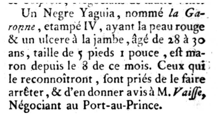 Un Negre Yaguia, nommé la Garonne, étampé IV, ayant la peau rouge & un ulcere à la jambe, âgé de 28 à 30 ans, taille de 5 pieds 1 pouce, est maron depuis le 8 de ce mois. Ceux qui le reconnoîtront, sont priés de le faire arrêter, & d'en donner avis à M. Vaisse, Négociant au Port-au-Prince.