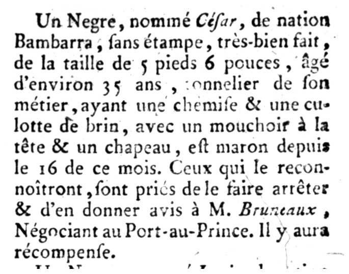 Un Negre, nommé César, de nation Bambara, sans étampe, très-bien fait, de la taille de 5 pieds 6 pouces, âgé d'environ 35 ans, tonnelier de son métier, ayant une chemise & une culotte de brin, avec un mouchoir à la tête & un chapeau, est maron depuis le 16 de ce mois. Ceux qui le reconnoîtront, sont priés de le faire arrêter & d'en donner avis à M. Bruneaux, Négociant au Port-au-Prince. Il y aura récompense.