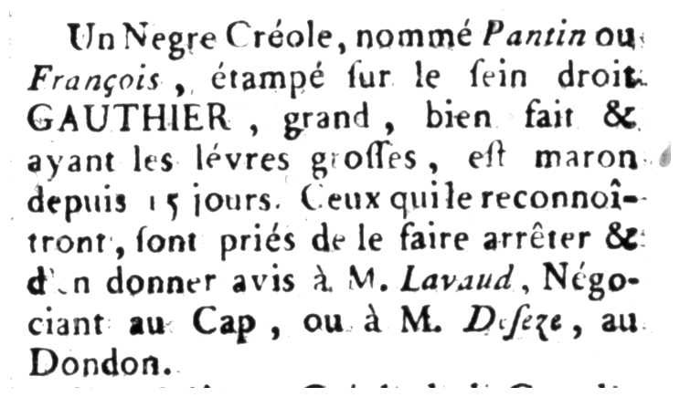 Un Negre Créole, nommé Pantin ou François, étampé sur le sein droit GAUTHIER, grand, bien fait & ayant les lévres grosses, est maron depuis 15 jours. Ceux qui le reconnoîtront, sont priés de le faire arrêter & d'en donner avis à M. Lavaud, Négociant au Cap, ou à M. Deseze, au Dondon.