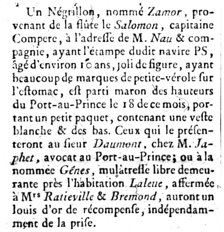 Un Négrillon, nommé Zamor, provenant de la flûte le Salomon, capitaine Compere, à l'adresse de M. Nau & compagnie, ayant l'étampe dudit navire PS, âgé d'environ 10 ans, joli de figure, ayant beaucoup de marques de petite-vérole sur l'estomac, est parti maron des hauteurs du Port-au-Prince le 18 de ce mois, portant un petit paquet, contenant une veste blanche & des bas. Ceux qui le présenteront au sieur Daumont, chez M. Japhet, avocat au Port-au-Prince; ou à la nommée Gênes, mulâtresse libre demeurante près l'habitation Laleue, affermée à Mrs Ratieville & Bremond, auront un louis d'or de récompense, indépendamment de la prise.