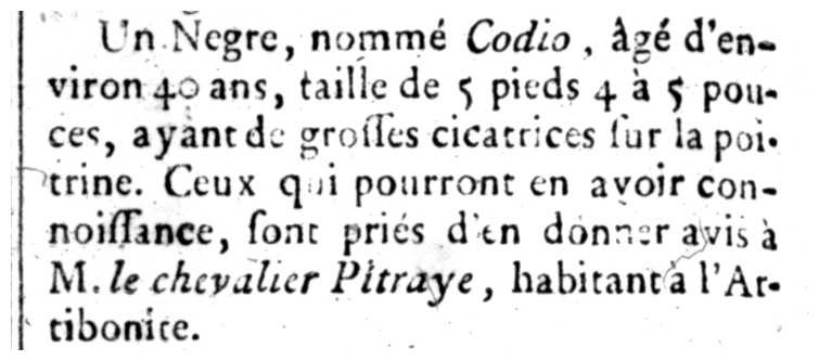 Un Negre, nommé Codio, âgé d'environ 40 ans, taille de 5 pieds 4 à 5 pouces, ayant de grosses cicatrices sur la poitrine. Ceux qui pourront en avoir connoissance, sont priés d'en donner avis à M. le chevalier Pitraye, habitant à l'Artibonite.