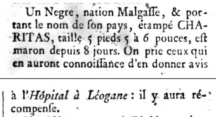 Un Negre, nation Malgaffe, & portant le nom de son pays, étampé CHARITAS, taille de 5 pieds 5 à 6 pouces, est maron depuis 8 jours. On prie ceux qui en auront connoissance d'en donner avis à l'Hôpital à Léogane ; il y aura récompense.
