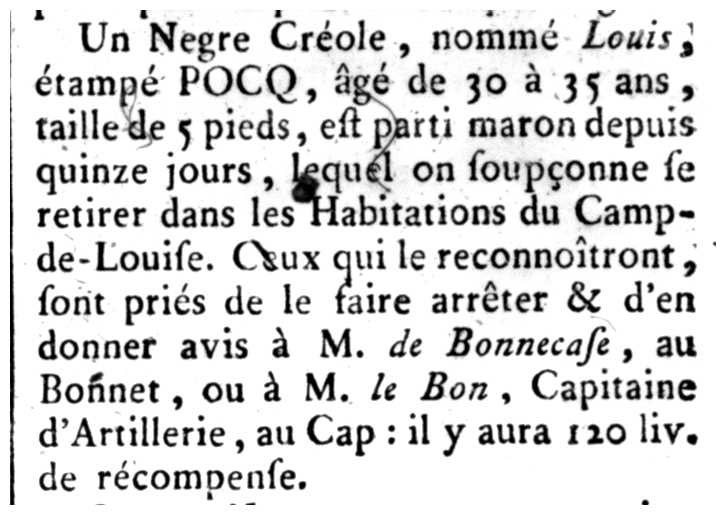 Un Negre Créole, nommé Louis, étampé POCQ, âgé de 30 à 35 ans, taille de 5 pieds, est parti maron depuis quinze jours, lequel on soupçonne se retirer dans les Habitations du Camp-de-Louis. Ceux qui le reconnoîtront, sont priés de le faire arrêter & d'en donner avis à M. de Bonnecase, au Bonnet, ou à M. le Bon, Capitaine d'Artillerie, au Cap : il y aura 120 liv. de récompense.