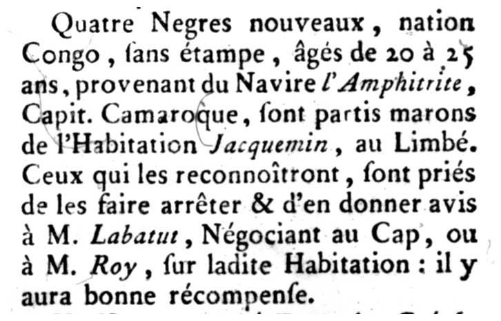 Quatres Negres nouveaux, nation Congo, sans étampe, âgés de 20 à 25 ans, provenant du Navire l'Amphitrite, Capit. Camaroque, sont partis marons de l'Habitation Jacquemin, au Limbé. Ceux qui les reconnoîtront, sont priés de les faire arrêter & d'en donner avis à M. Labatut, Négociant au Cap, ou à M. Roy, sur ladite Habitation : il y aura récompense.