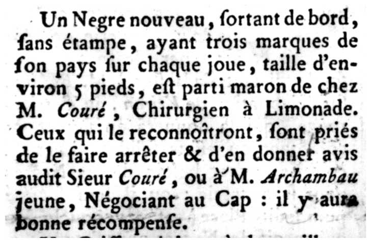Une Negre nouveau, sortant de bord, sans étampe, ayant trois marques de son pays sur chaque joue, taille d'environ 5 pieds, est parti maron de chez M. Couré, Chirurgien à Limonade. Ceux qui le reconnoîtront, sont priés de le faire arrêter & d'en donner avis audit Sieur Couré, ou à M. Archambau jeune, Négociant au Cap : il y aura bonne récompense.