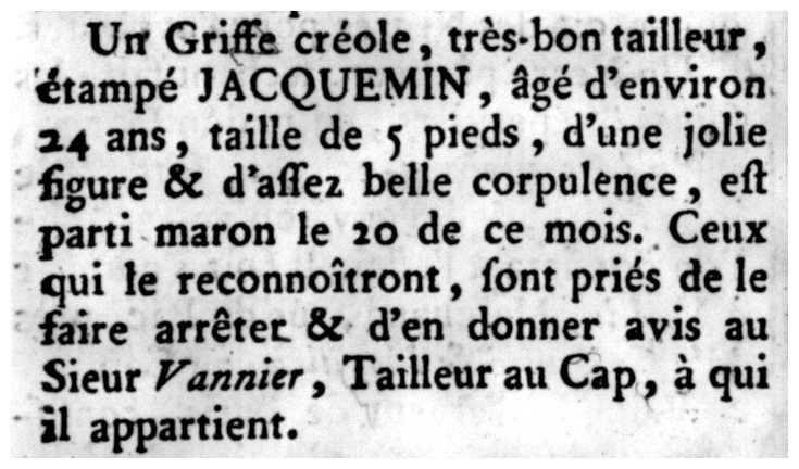 Un Griffe créole, très-bon tailleur, étampé JACQUEMIN, âgé d'environ 24 ans, taille de 5 pieds, d'une jolie figure & d'assez belle corpulence, est parti maron le 20 de ce mois. Ceux qui le reconnoîtront, sont priés de le faire arrêter & d'en donner avis au sieur Vannier, Tailleur au Cap, à qui il appartient.