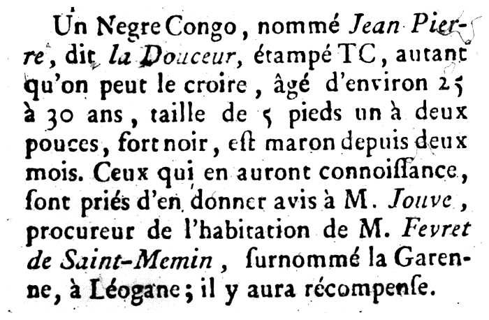 Un Negre Congo, nommé Jean Pierre, dit la Douceur, étampé TC, autant qu'on peut le croire, âgé d'environ 25 à 30 ans, taille de 5 pieds un à deux pouces, fort noir, est maron depuis deux mois. Ceux qui en auront connoissance, sont priés d'en donner avis à M. Jouve, procureur de l'habitation de M. Fevret de Saint-Memin, surnommé la Garenne, à Léogane ; il y aura récompense.