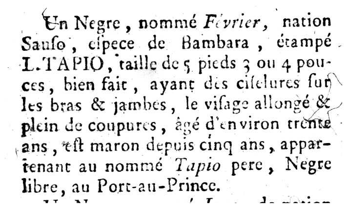 Un Negre, nommé Février, nation Saufo, espece de Bambara, étampé L. TAPIO, taille de 5 pieds 3 ou 4 pouces, bien fait, ayant des ciselures sur les bras & jambes, le visage allongé & plein de coupures, âgé d'environ trente ans, est maron depuis cinq ans, appartenant au nommé Tapio pere, Negre libre, au Port-au-Prince.
