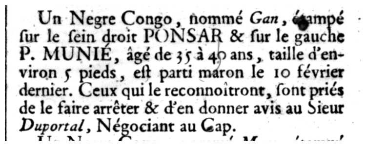 Un Negre Congo, nommé Gan, étampé sur le sein droit PONSAR & sur le gauche P. MUNIÉ, âgé de 35 à 40 ans, taille d'environ 5 pieds, est parti maron le 10 février dernier. Ceux qui le reconnoîtront, sont priés de le faire arrêter & d'en donner avis au Sieur Duportal, Négociant au Cap.