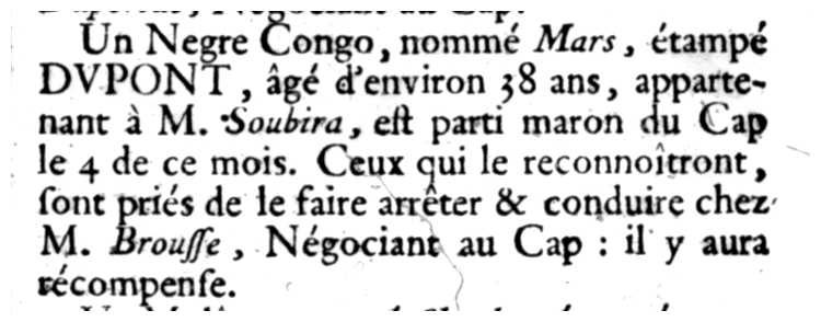Un Negre Congo, nommé Mars, étampé DVPONT, âgé d'environ 38 ans, appartenant à M. Soubira, est parti maron du Cap le 4 de ce mois. Ceux qui le reconnoîtront, sont priés de le faire arrêter & conduire chez M. Brousse, Négociant au Cap : il y aura récompense.