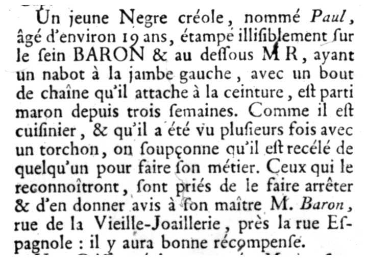 Un jeune Negre créole, nommé Paul, âgé d'environ 19 ans, étampé illisiblement sur le sein BARON & au dessous M R, ayant un nabot à la jambe gauche, avec un bout de chaîne qu'il attache à la ceinture, est parti maron depuis trois semaines. Comme il est cuisinier, & qu'il a été vu plusieurs fois avec un torchon, on soupçonne qu'il est recélé de quelqu'un pour faire son métier. Ceux qui le reconnoîtront, sont priés de le faire arrêter & d'en donner avis à son maître M. Baron, rue de la Vieille-Joaillerie, près la rue Espagnole : il y aura bonne récompense.