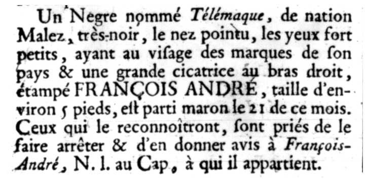 Un Negre nommé Télémaque, de nation Malez, très-noir, le nez pointu, le yeux fort petits, ayant au visage des marques de son pays & une grande cicatrice au bras droit, étampé FRANÇOIS ANDRÉ, taille d'environ 5 pieds, est parti maron le 21 de ce mois. Ceux qui le reconnoîtront, sont priés de le faire arrêter & d'en donner avis à François André, N. l. au Cap, à qui il appartient.