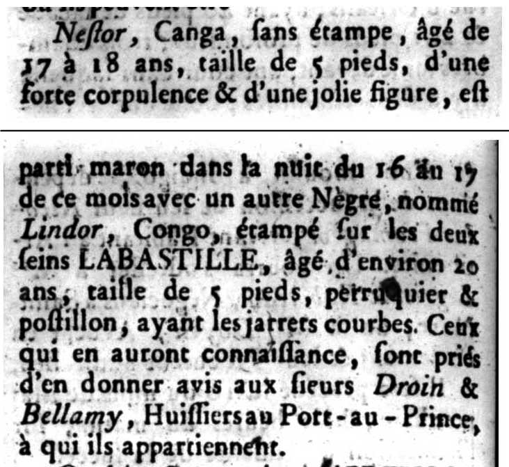 Nestor, Canga, sans étampe, âgé de 17 à 18 ans, taille de 5 pieds, d'une forte corpulence & d'une jolie figure, est parti maron dans la nuit du 16 au 17 de ce mois avec un autre Nègre nommé Lindor, Congo, étampé sur les deux seins LABASTILLE, âgé d'environ 20 ans, taille de 5 pieds, perruquier & postillon, ayant les jarrets courbes. Ceux qui en auront connaissance, sont priés d'en donner avis aux sieurs Droin & Bellamy, Huissiers au Port-au-Prince, à qui ils appartiennent.