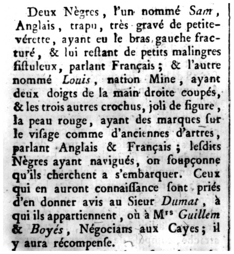 Deux Nègres, l'un nommé Sam, Anglais, trapu, très gravé de petite-vérette, ayant le bras gauche fracturé, & lui restant de petits malingres fistuleux, parlant Français; & l'autre nommé Louis, nation Mine, ayant deux doigts de la main droite coupés, & les trois autres crochus, joli de figure, la peau rouge, ayant des marques sur le visage comme d'anciennes d'artres, parlant Anglais & Français : lesdits Nègres ayant navigués, on soupçonne qu'ils cherchent a s'embarquer. Ceux qui en auront connaissance sont priés d'en donner avis au Sieur Dumat, à qui ils appartiennent, où à Mrs Guillem & Boyés, Négocians aux Cayes; il y aura récompense.