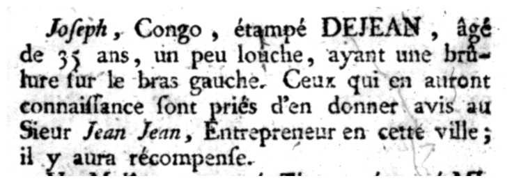 Joseph, Congo, étampé DEJEAN, âgé de 35 ans, un peu louche, ayant une brûlure sur le bras gauche. Ceux qui en auront connaissance sont priés d'en donner avis au sieur Jean Jean, Entrepreneur en cette ville; il y aura récompense.