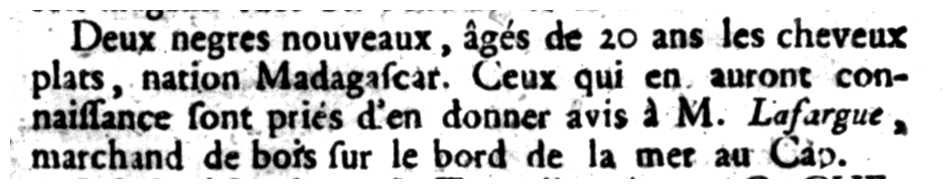 Deux negres nouveaux, âgés de 20 ans les cheveux plats, nation Madagascar. Ceux qui en auront connaissance sont priés d'en donner avis à M. Lafargue, marchand de bois sur le bord de la mer au Cap.