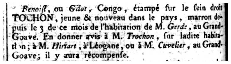 Benoist, ou Gilot, Congo, étampé sur le sein droit TOCHON, jeune & nouveau dans le pays, marron depuis le 3 de ce mois de l’habitation de M. Gerde, au Grand-Goave. En donner avis à M. Trochon, sur ladite habitation; à M. Hiriart, à Léogane, ou à M. Cuvelier, au Grand-Goave; il y aura récompense.