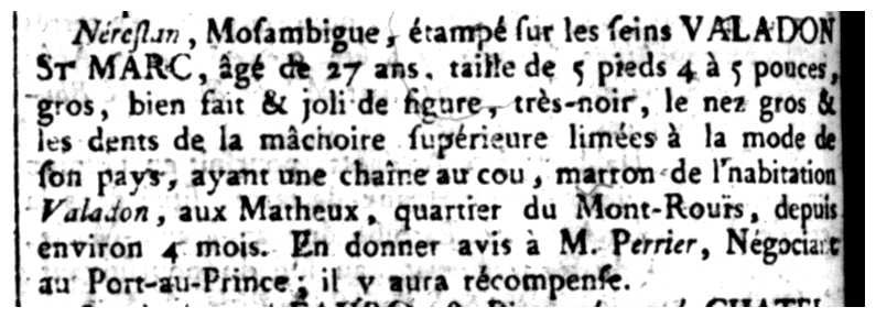 Nérestan, Mosambigue, étampé sur les seins VALADON ST MARC, âgé de 27 ans, taille de 5 pieds 4 à 5 pouces, gros, bien fait & joli de figure, très-noir, le nez gros & les dents de la mâchoire supérieure limées à la mode de son pays, ayant une chaîne au cou, marron de l’habitation Valadon, aux Matheux, quartier du Mont-Rouïs, depuis environ 4 mois. En donner avis à M. Pierrier, Négociant au Port-au-Prince ; il y aura récompense.