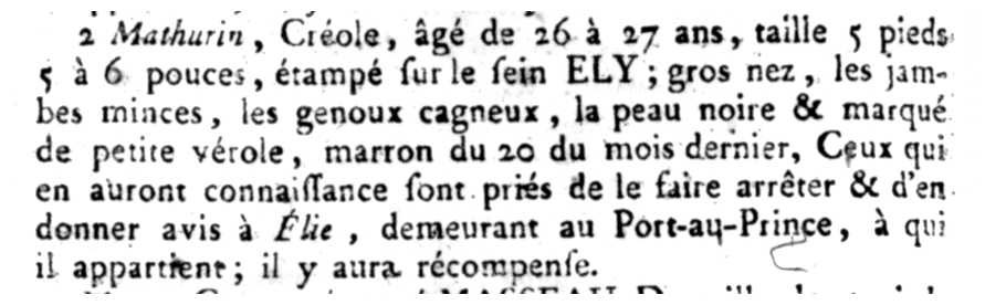 Mathurin, Créole, âgé de 26 à 27 ans, taille 5 pieds 5 à 6 pouces, étampé sur le sein ELY; gros nez, les jambes minces, les genoux cagneux, la peau noire & marqué de petite vérole, marron du 20 du mois dernier. Ceux qui en auraient connaissance sont priés de le faire arrêter & d'en donner avis à Élie, demeurant au Port-au-Prince, à qui il appartient; il y aura récompense.