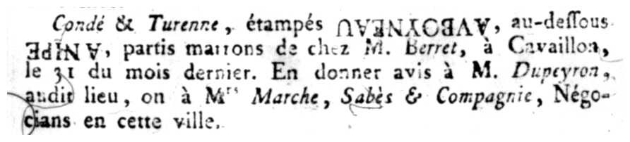 Condé & Turenne, étampés AVBOYNEAU, au-dessous ANIPE, partis marrons de chez M. Berret, à Cavaillon, le 31 du mois dernier. En donner avis à M. Dupeyron, audit lieu, ou à Mrs Marche, Sabès & Compagnie, Négocians en cette ville.