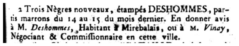 Trois Nègres nouveaux, étampés DESHOMMES, partis marrons du 14 au 15 du mois dernier. En donner avis à M. Deshoinines, Habitant à Mirebalais, ou à M. Vinay, Négociant & Commissionnaire en cette ville.