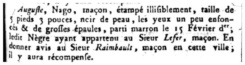 Auguste, Nago, maçon étampé illisiblement, taille de 5 pieds 3 pouces, noir de peau, les yeux un peu enfoncés & de grosses épaules, partis marron le 15 Février der, ledit Nègre ayant appartenu au Sieur Lefer, maçon. En donner avis au Sieur Raimbault, maçon en cette ville; il y aura récompense.