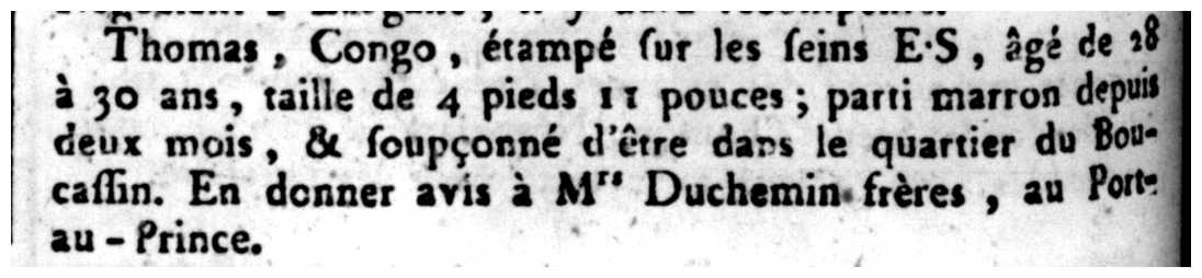 Thomas, Congo, étampé sur les seins E[.]S, âgé de 28 ans à 30 ans, taille de 4 pieds 11 pouces; parti marron depuis deux mois, & soupçonné d'être dans le quartier du Boucassin. En donner avis à Mrs Duchemin frères, au Port-au-Prince.