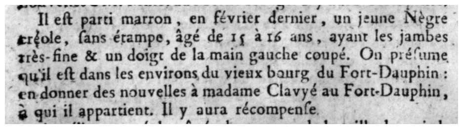 Il est parti marron, en février dernier, un jeune Nègre créole, sans étampe, âgé de 15 à 16 ans, ayant les jambes très-fine & un doigt de la main gauche coupé. On présume qu'il est dans les environs du vieux bourg du Fort-Dauphin : en donner des nouvelles à madame Clavyé au Fort-Dauphin, à qui il appartient. Il y aura récompense.