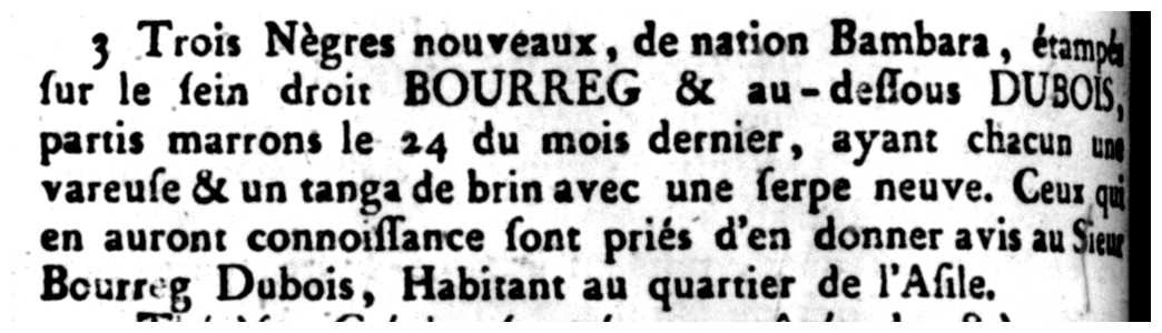 Trois Nègres nouveaux, de nation Bambara, étampés sur le sein droit BOURREG & au-dessous DUBOIS, partis marrons le 24 du mois dernier, ayant chacun une vareuse & un tanga de brin avec une serpe neuve. Ceux qui en auront connaissance sont priés d'en donner avis au Sieur Bourreg Dubois, Habitant au quartier de l'Asile.
